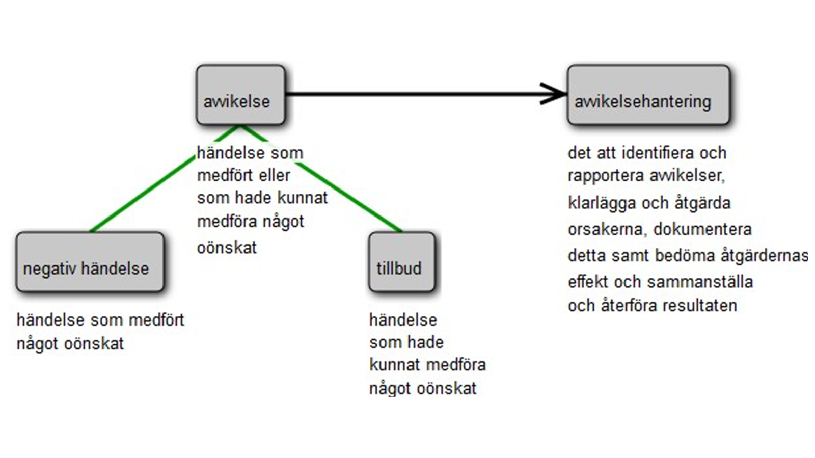 – det att identifiera och rapportera avvikelser, klarlägga och åtgärda orsakerna, dokumentera detta samt bedöma åtgärdernas effekt och sammanställa och återföra resultaten.Terminologifrämjandet, se fig. 1